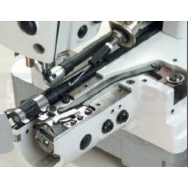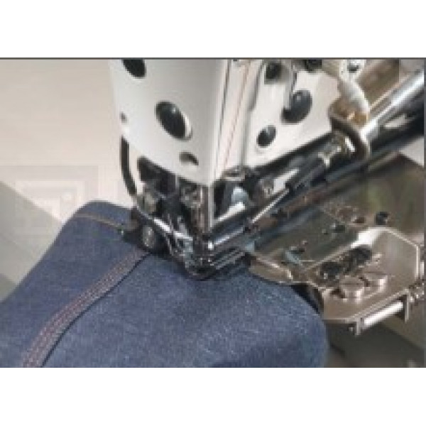 Челночная машина с цилиндрической платформой и автоматической обрезкой ниток, разработанная для подгибки низа на джинсах, брюках и рабочей одежде.