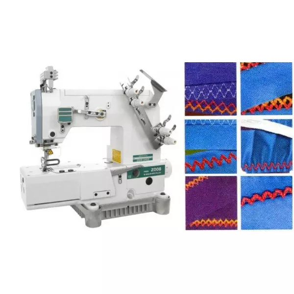 Двухигольная промышленная швейная машина цепного стежка Siruba Z008-248Q с приспособлением для изготовления декоративных зигзагообразных стежков типа "кроше" на женском нижнем белье, носовых платках, скатертях, вечерних платьях, детской одежде, спортивной одежде и наволочках.