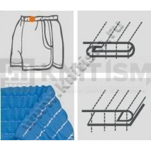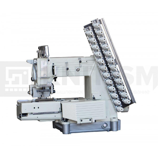 Высокоскоростная поясная 12-ти игольная промышленная швейная машина двухниточного цепного стежка с цилиндрической платформой и задним пуллером. Предназначена для обработки поясов нижнего белья, спортивной одежды и другого трикотажа двухниточным цепным стежком.