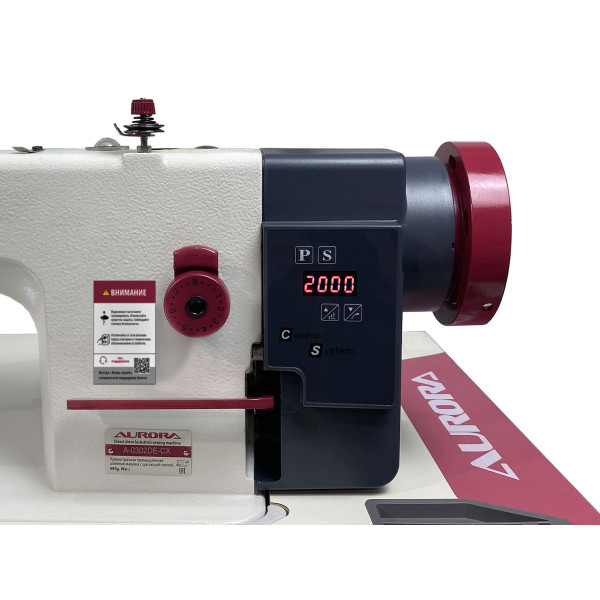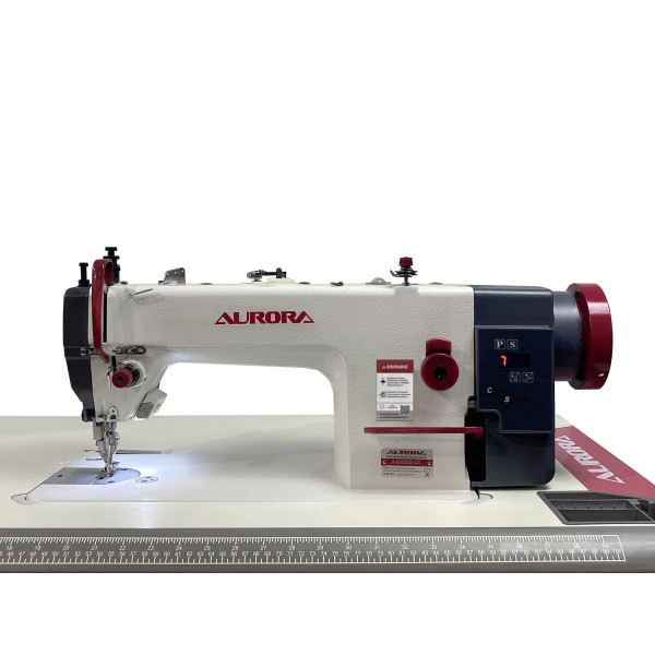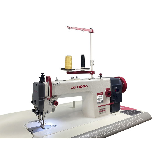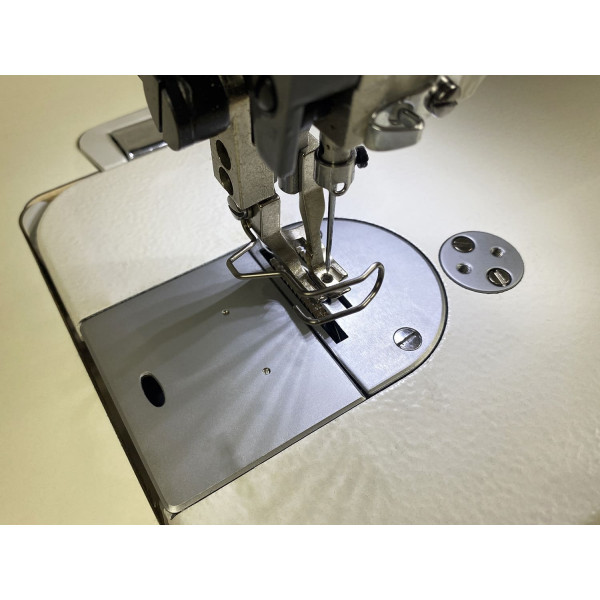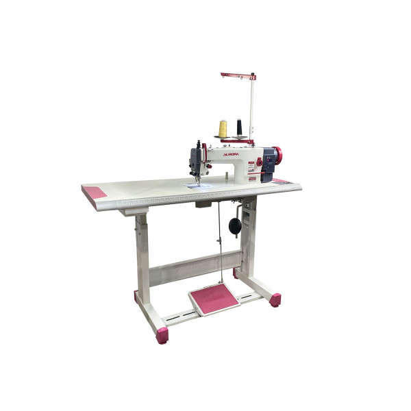 Прямострочная машина челночного стежка с прямым приводом, шагающей лапкой и увеличенным челноком для шитья тяжелых материалов толстой нитью. Длина стежка 8 мм.