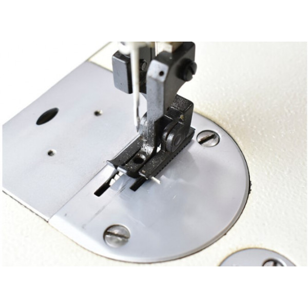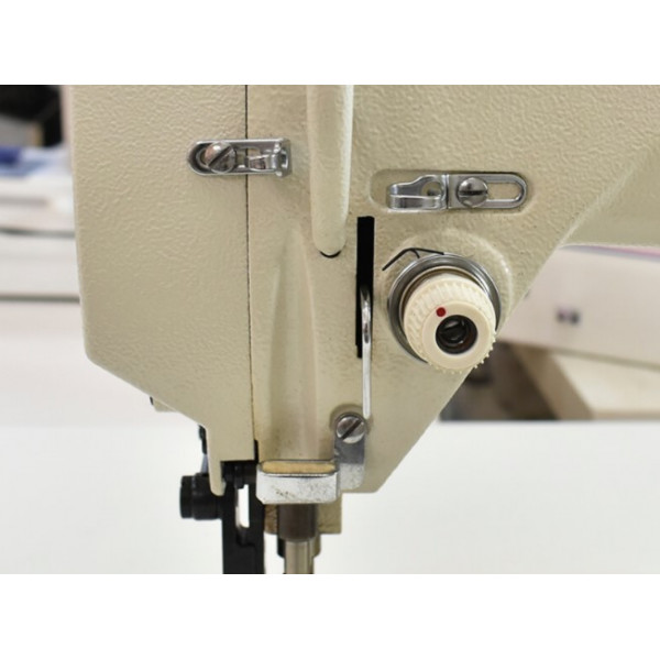 Прямострочная швейная машина с двойным продвижением, увеличенным челноком и удлиненной платформой. Машина предназначена для шитья изделий из тяжелых материалов (тентов, чехлов, сумок, дубленок и т. д.).