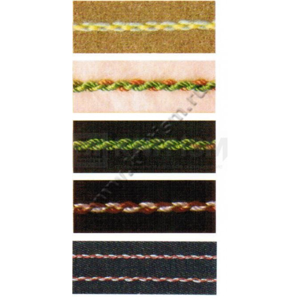 Машина предназначена для декорирования перекрещивающимися нитями и может быть использована для украшений верхней одежды, пальто, дубленок, джинсовой ткани, кожи, плащевой ткани. В механизме машины перед иглой установлены два петлителя, которые укладывают, заправленную в них нитку, в косичку либо волну, которую идущая следом игла прошивает и фиксирует на ткани. Волна образуется при заправке нити только в один из петлителей. Различный дизайн строчек можно получить благодаря использованию разных типов и толщин ниток для укладки.