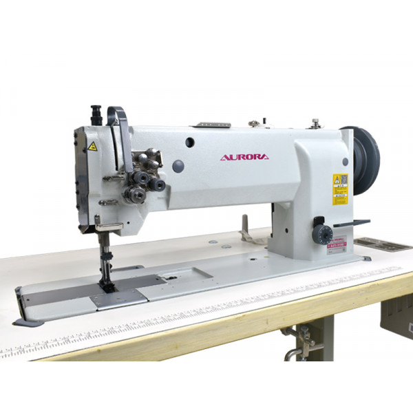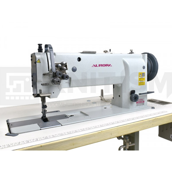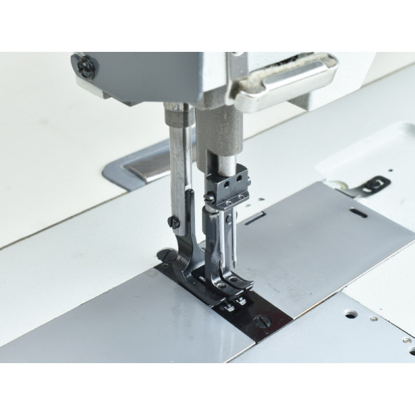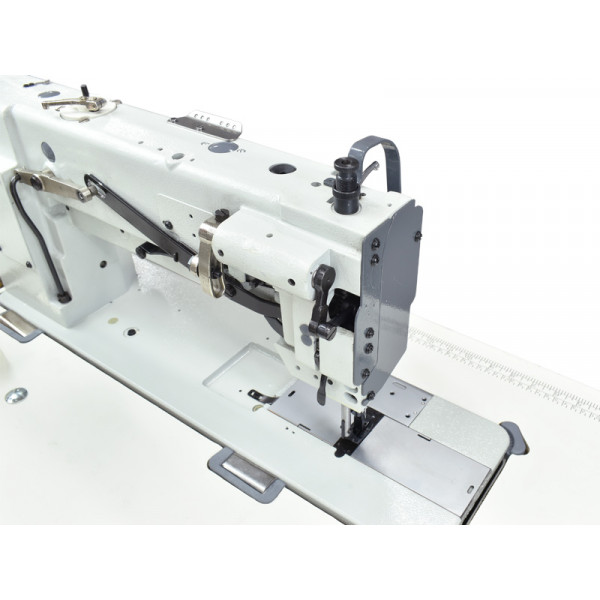 Двухигольная машина челночного стежка с тройным (унисонным) продвижением, увеличенным вылетом рукава и увеличенными вертикальными челноками. Машина предназначена для шитья тяжелых материалов двумя параллельными строчками при изготовлении тентов, палаток и мебельных чехлов.