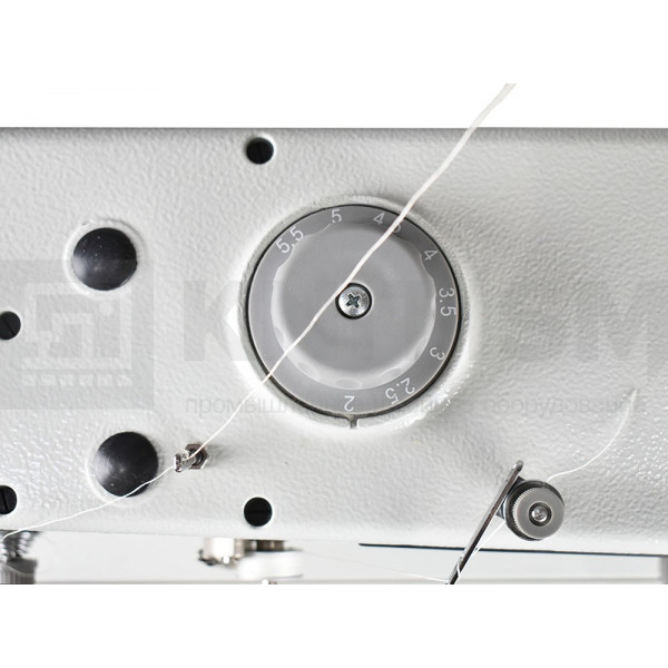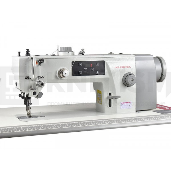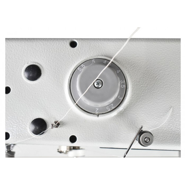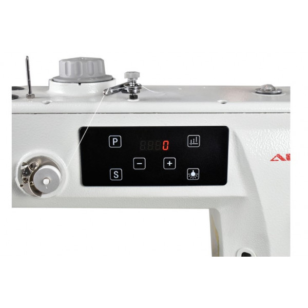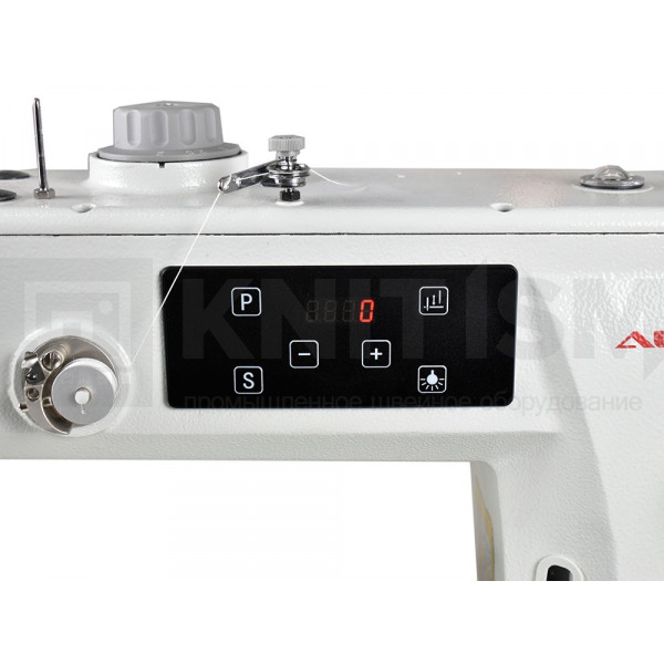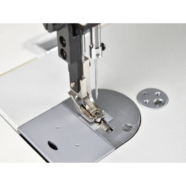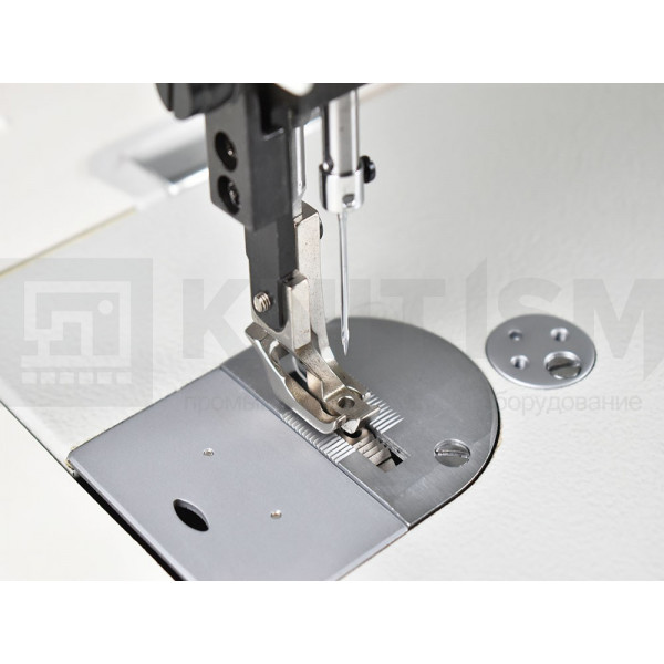 Автоматическая смазка. Увеличенный вылет рукава 330 мм для удобства обработки крупногабаритных изделий. Прямой привод обеспечивает значительную экономию энергии по сравнению с фрикционными моторами. В машине использовано челночное устройство с увеличенным объемом шпули, что позволяет сократить число перезаправок ниток в челноке. Надежную подачу обеспечивают два двигателя материала, работающих синхронно - нижняя зубчатая рейка и шагающая лапка. Игла за все время подачи не выходит из материала, причем ее горизонтальная скорость равна скорости подачи материала на всей длине стежка, что и обеспечивает выполнение шва высокого качества без посадки слоев друг относительно друга.
