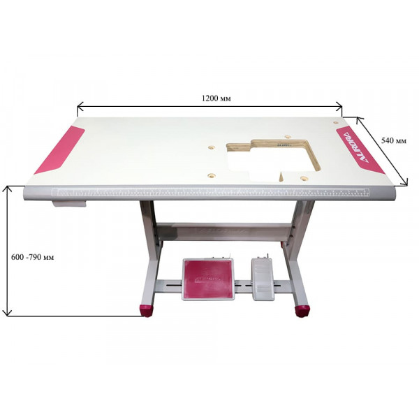 Столешница (скошенный перед) Цвет столешницы: белый, поверхность - гладкая Окантовка стола: пластик, цвет - красный + серый Размер столешницы: 120x54 см Толщина столешницы: 35 мм Высота стола: 600-790 мм Ноги: прямые Толщина металла ног: 1,5 мм Цвет окраски ног: белый Цвет резиновых заглушек ног: красный Педаль: одна большая с резиновым ковриком + малая металлическая Комплектация и дополнительные опции: