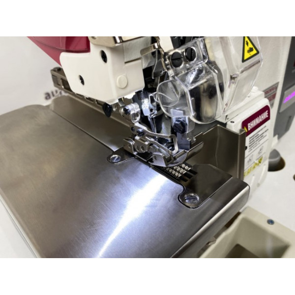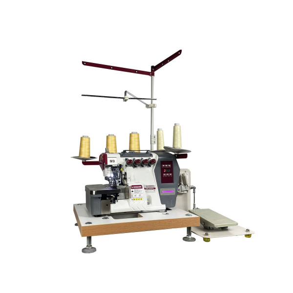 Современная портативная высокоскоростная пятиниточная двухигольная стачивающе-обметочная машина (5-и ниточный оверлок) с автоматическим подьемом лапки, прямым сервоприводом, регулировкой скорости и позиционированием иглы, предназначен для обметывания цепным стежком краев деталей швейных изделий из средних и тяжелых материалов.