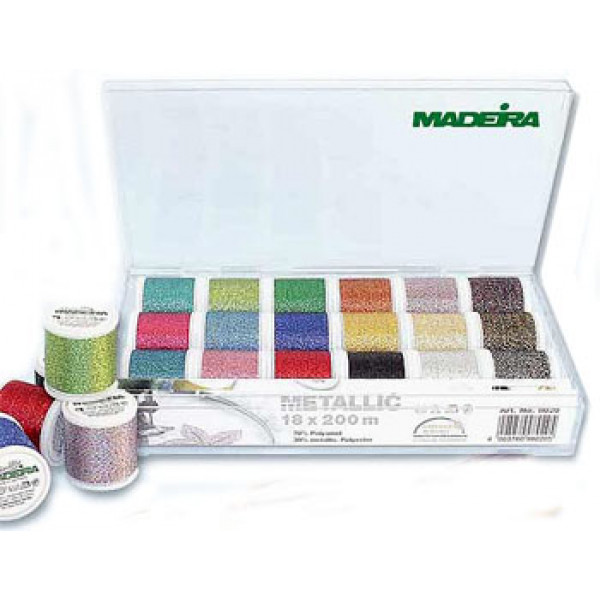 В набор металлизированных вышивальных ниток входит 18 катушек 200м - Metallic №40 70% полиамид, 30% металлизированный полиэстер. Рекомендуются для машинного вышивания на бытовых и промышленных вышивальных и швейно-вышивальных машинах любых марок, а так же для рукоделия.