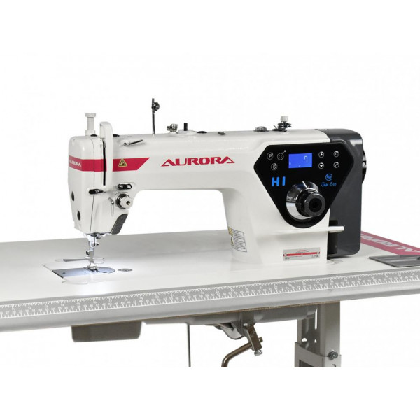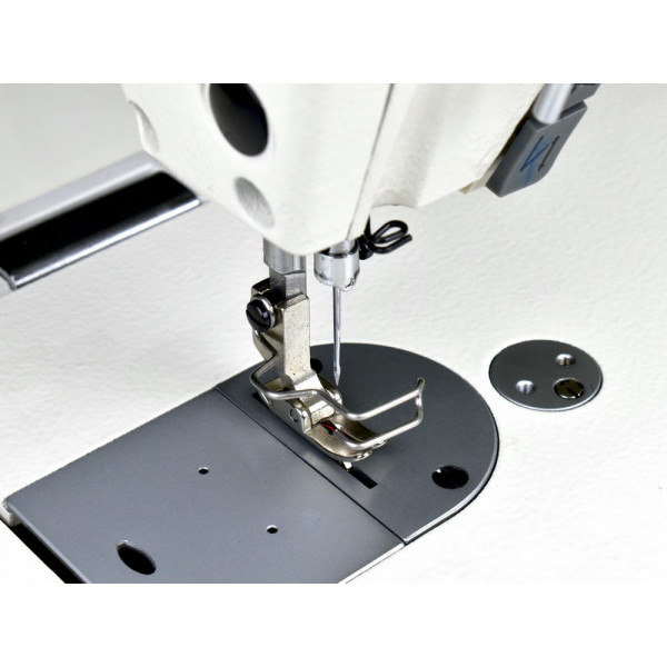 Одноигольная прямострочная машина челночного стежка для шитья легких и средних материалов со встроенным в головку сервоприводом, позиционером иглы, функцией плавный старт, функцией пошагового шитья и светодиодной подсветкой области шитья.