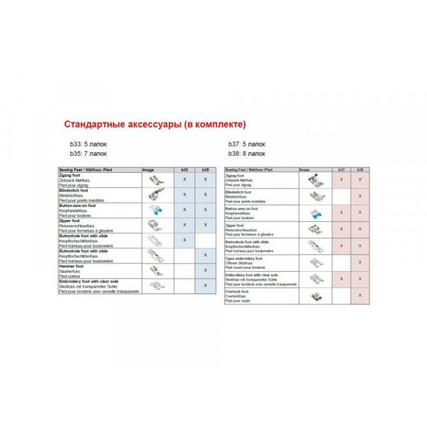 Лапки в комплектестандартная-зигзаг (установлена на машине), для обметывания петель, для вшивания молнии, для потайной строчки, для пришивания пуговиц
