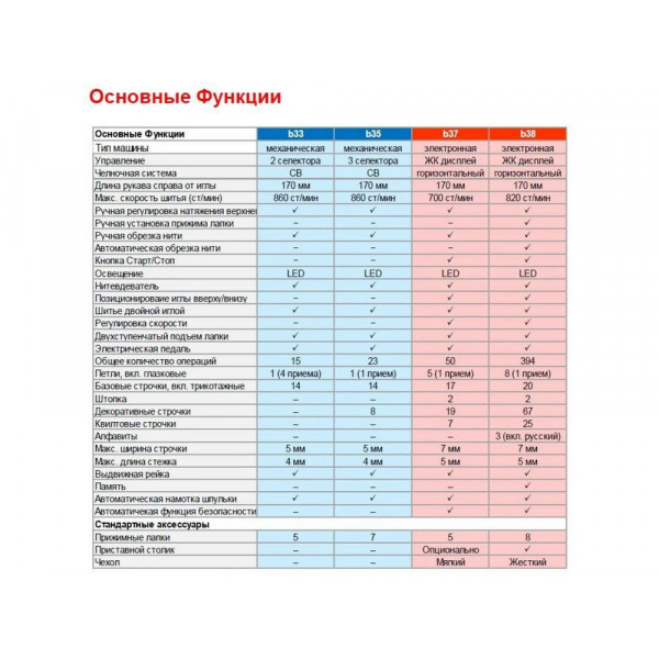 Функции и особенностикнопка/клавиша реверса, система измерения размера пуговицы, горизонтальный позиционер, шитье двойной иглой, рукавная платформа (свободный рукав), швейный советник, встроенное отделение для хранения аксессуаров, мягкий брезентовый чехол