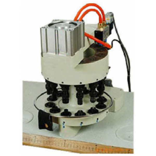 Повышение производительности за счет 12-ти головок, на каждой из которых можно установить различные специальные насадки для установки фурнитуры в зависимости от выполняемых операций (одна головка вырубает отверстие, другая устанавливает люверс и т.д.)